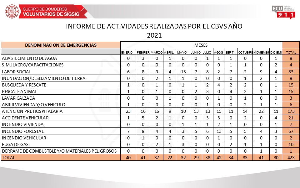 Efectuá acciones de salvamento y atención pre-hospitalaria con el propósito de precautelar la seguridad de la ciudadanía en la circunscripción territorial del cantón Sígsig. En este contexto ha atendido las siguientes emergencias: